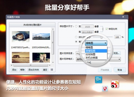 一鍵添加文件夾,無需重復(fù)逐個選取。具備多種圖片格式轉(zhuǎn)換方式,還可智能設(shè)為微博貼圖、論壇貼圖等多種常用尺寸。