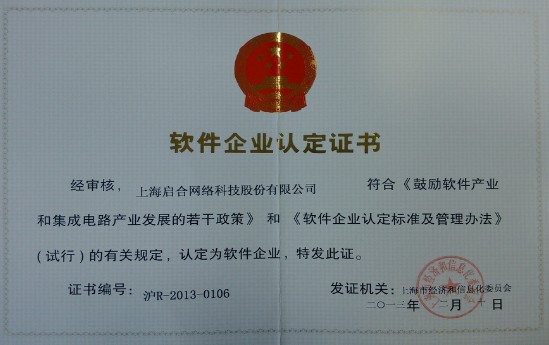 2013年02月10日,2345.com經上海市經濟和信息化委員會正式認定為“雙軟企業(yè)”,獲得了由上海市經濟和信息化委員會正式頒發(fā)的“軟件企業(yè)認定證書”(證書編號:滬R-2013-0106)。