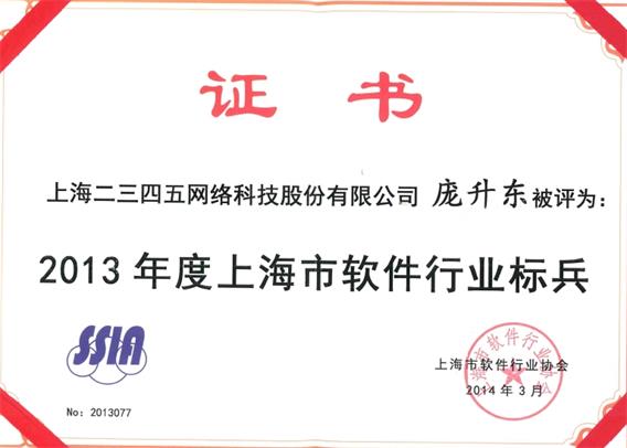 2014年3月26日下午,上海市軟件行業(yè)協(xié)會(huì)2014年工作年會(huì)暨“上海市軟件行業(yè)標(biāo)兵&軟件行業(yè)服務(wù)明星”評(píng)選活動(dòng)頒獎(jiǎng)典禮在上海市經(jīng)濟(jì)管理干部學(xué)院禮堂舉行。上海市經(jīng)信委、科委、發(fā)改委、商務(wù)委等相關(guān)部門(mén)負(fù)責(zé)人,相關(guān)產(chǎn)業(yè)園區(qū)(基地)、行業(yè)協(xié)會(huì)、軟件企業(yè)負(fù)責(zé)人及十余家媒體記者,約300人到會(huì)。本次評(píng)選活動(dòng)中二三四五董事長(zhǎng)龐升東獲得軟件行業(yè)標(biāo)兵稱(chēng)號(hào),二三四五軟件研發(fā)中心李春志獲得軟件服務(wù)明星稱(chēng)號(hào)。