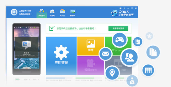 通過數(shù)據(jù)線的方式將手機連接至PC,便可以通過2345王牌手機助手下載海量應用,游戲、應用軟件一應俱全。還可以通過它進行應用管理、任務管理、短信和聯(lián)系人的備份和恢復、圖片視頻音樂等的導入導出等等。