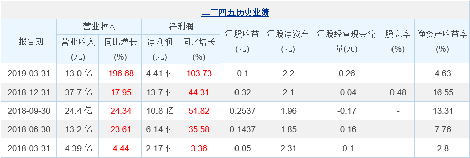 二三四五4月18日最新公布的2019年一季報(bào)顯示,其營(yíng)業(yè)收入13.0億元,同比增長(zhǎng)196.68%;歸屬于上市公司股東的凈利潤(rùn)4.41億元,同比增長(zhǎng)103.73%?;久抗墒找?.1元。