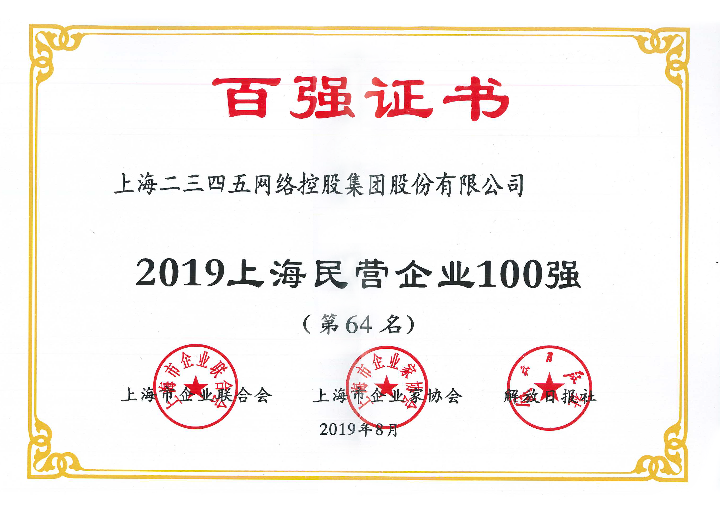 8月19日,上海市企業(yè)聯(lián)合會、上海市企業(yè)家協(xié)會、上海市經(jīng)濟團體聯(lián)合會聯(lián)合發(fā)布2019上海百強企業(yè)榜單,上海二三四五網(wǎng)絡(luò)控股集團股份有限公司(簡稱“二三四五”,股票代碼002195)再次登榜,榮居上海民營企業(yè)百強排行64名,較上年上升5名。二三四五還同時蟬聯(lián)上海服務業(yè)企業(yè)100強和上海民營服務業(yè)企業(yè)100強。