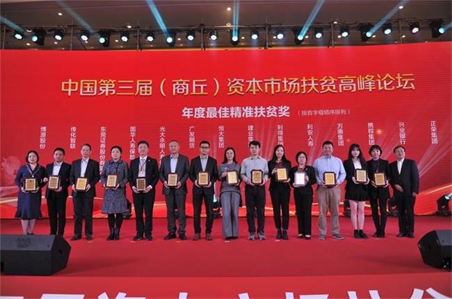 “年度最佳精準(zhǔn)扶貧獎(jiǎng)”:博源股份、傳化智聯(lián)、東莞證券股份有限公司、國(guó)華人壽保險(xiǎn)、光大永明人壽保險(xiǎn)、廣發(fā)期貨、恒大集團(tuán)、建業(yè)集團(tuán)、利得集團(tuán)、利安人壽、萬(wàn)惠集團(tuán)、攜程集團(tuán)、興業(yè)銀行、正榮集團(tuán)。
