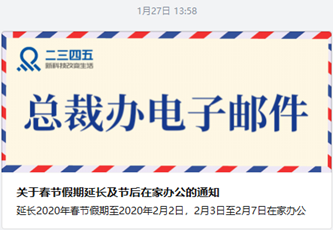 1月27日,2點27分,國務院辦公廳發(fā)布關于春節(jié)假期延長的通知。當天13點58分,二三四五發(fā)布《關于春節(jié)假期延長及節(jié)后在家辦公的通知》全員郵件,宣布延長2020年春節(jié)假期至2020年2月2日,并宣布2月3日至2月7日期間,二三四五小伙伴居家遠程辦公。
