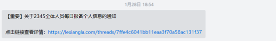 于是1月25日,農(nóng)歷大年初一,二三四五再次發(fā)布通知,提醒全員加強健康報備以及其他防疫注意事項。