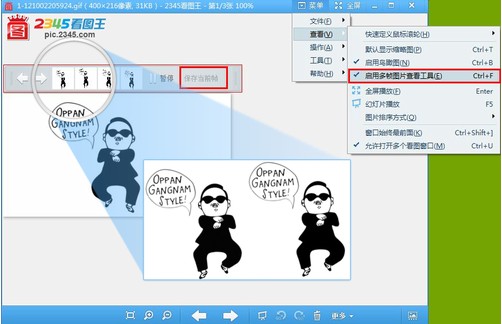 首先,獨(dú)有的多幀圖片查看工具支持GIF等多幀圖片的播放與單幀保存。最近十分流行鳥(niǎo)叔的江南STYLE騎馬舞步,用2345看圖王可以快速瀏覽學(xué)習(xí)每一個(gè)動(dòng)作,讓自己時(shí)刻處于時(shí)尚潮流的前端。