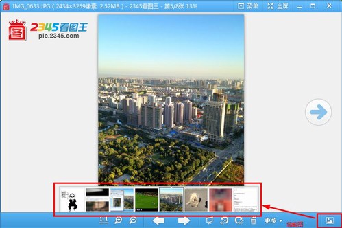 其次,2345看圖王擁有縮略圖功能,點(diǎn)擊看圖窗口右下角“縮略圖”按鈕,顯示縮略圖欄??s略圖欄顯示內(nèi)容是當(dāng)前圖片所在文件夾中的所有圖片。在鼠標(biāo)滾輪功能設(shè)置為圖像縮放情況下,當(dāng)鼠標(biāo)指針在縮略圖欄區(qū)域內(nèi),我們可以通過(guò)鼠標(biāo)滾輪進(jìn)行翻頁(yè);而當(dāng)鼠標(biāo)指針在非縮略圖欄區(qū)域內(nèi),鼠標(biāo)滾輪的功能就變成放大縮?。ㄈ鐖D3)。我們可以在快速瀏覽圖片的同時(shí),關(guān)注圖片的每一個(gè)細(xì)節(jié),讓瀏覽圖片更高效。